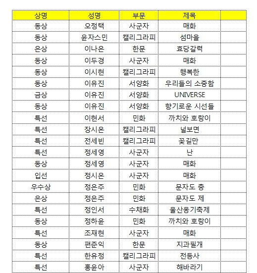 2019 전국향토문화예술학생대전 입상발표명단 페이지 정보 작성자 관리자 댓글 0건 조회 47회 작성일 25-10-13 05:04 목록 본문 총 117점 접수 / 51점 입상 이전글2019 대한민국향토문화미술대전(일반)입상발표명단 25.10.13 다음글2019 대한민국향토문화미술대전(일반) 공모안내 25.10.13 댓글 0 댓글목록 등록된 댓글이 없습니다.
