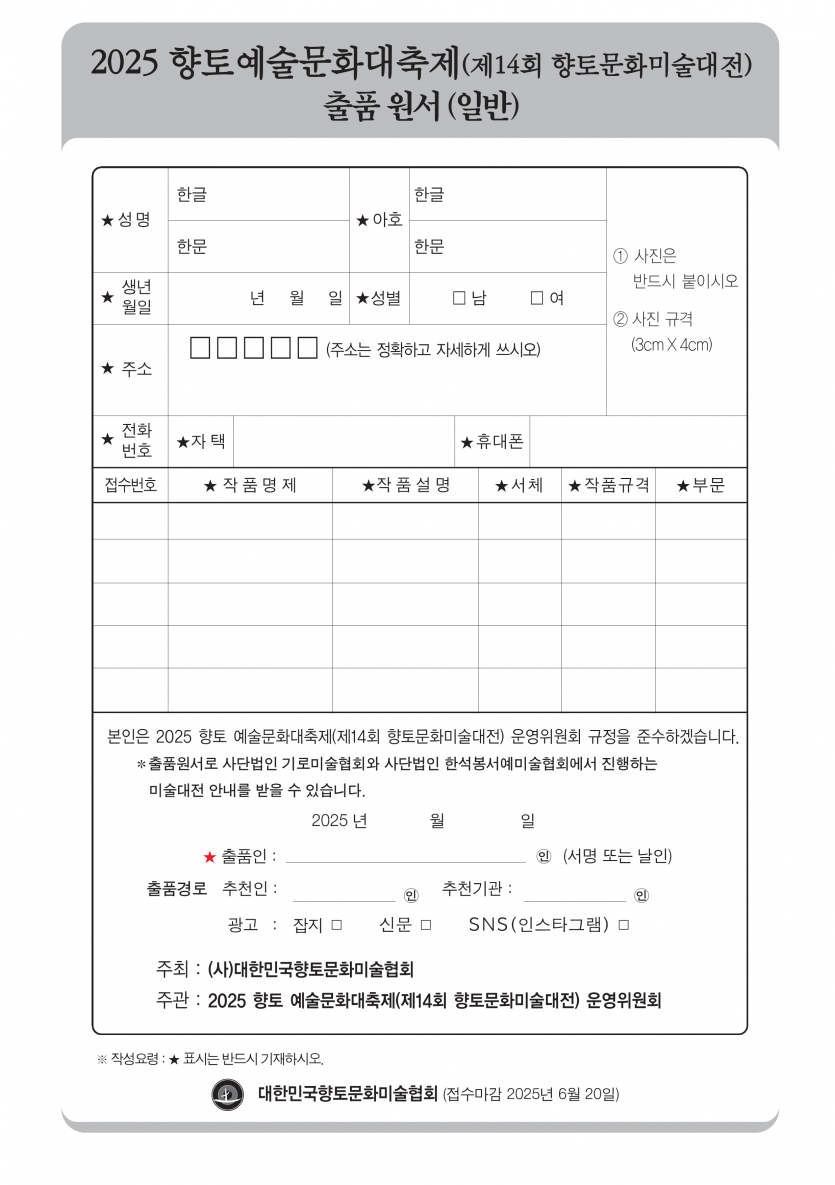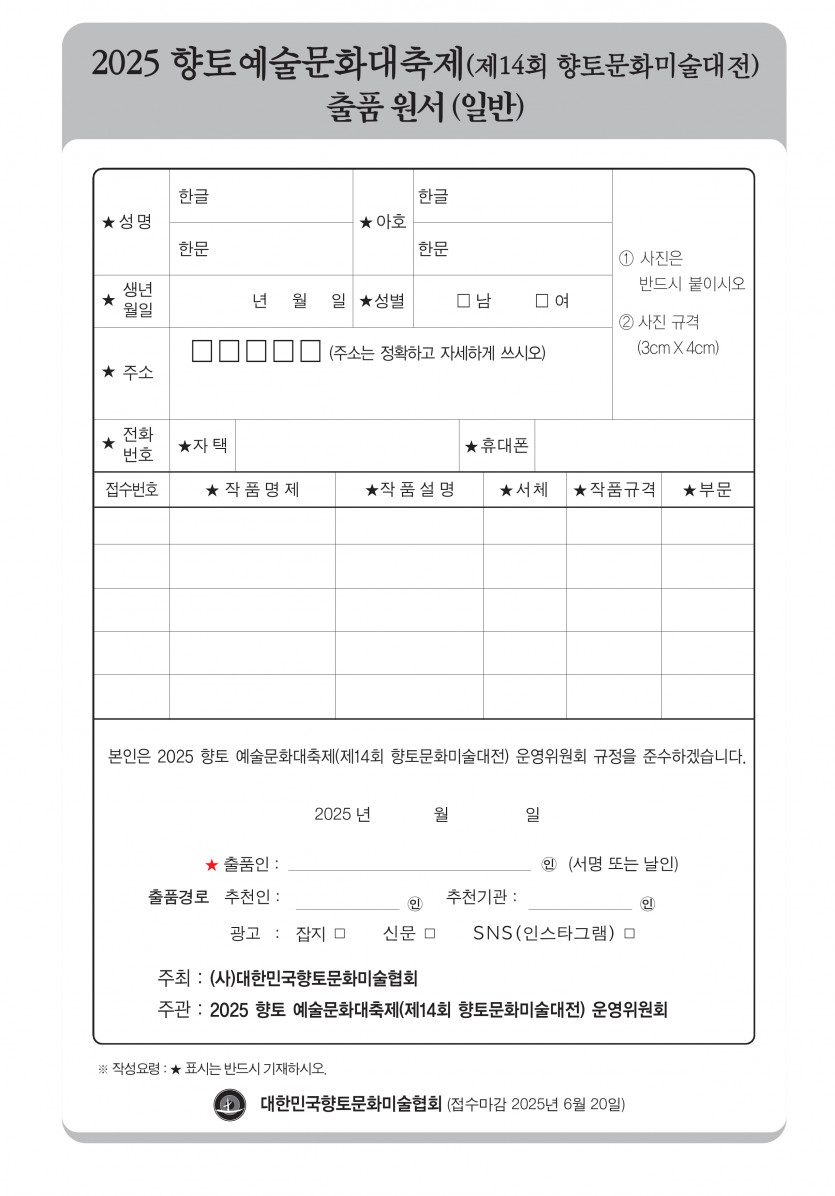 2025년도 14회 대한민국향토문화미술대전 출품원서(일반) 올려드립니다.